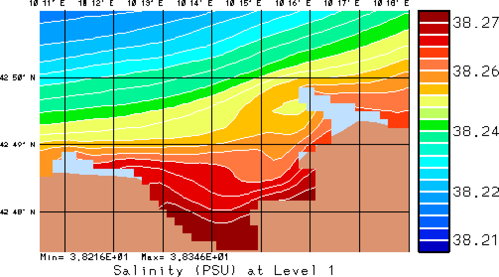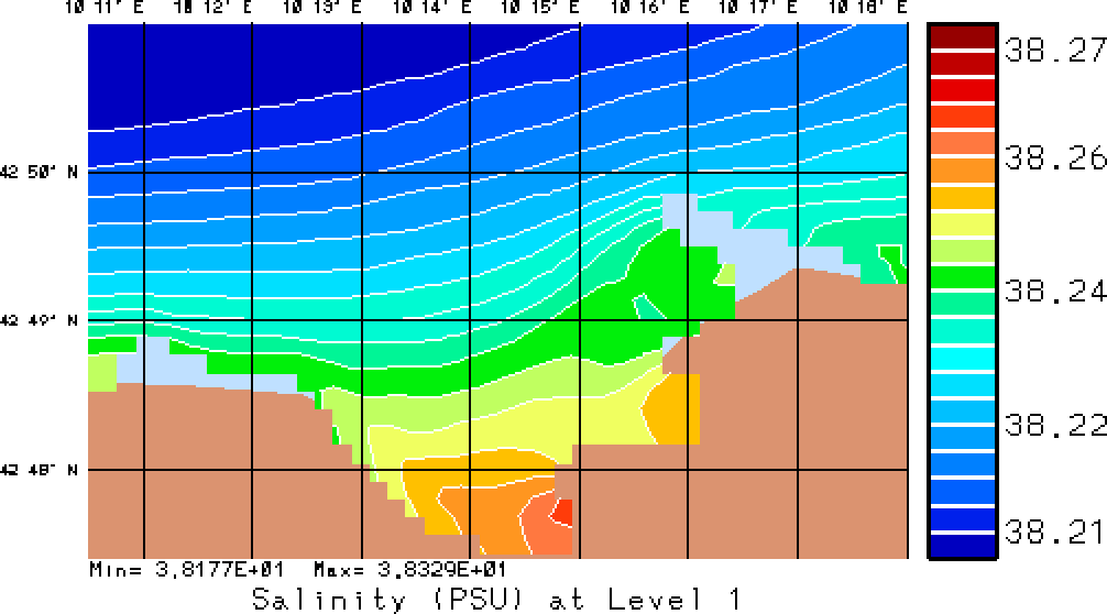 The results presented below show temperature, salinity and total velocity vectors at the surface. The land-mask on the velocity plot is the same as on the temperature and salinity plots, although it appears over simplified. The coasts plotted are for display purposes only.