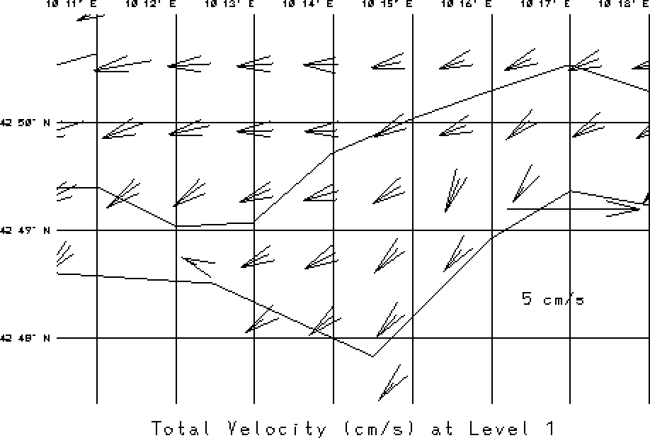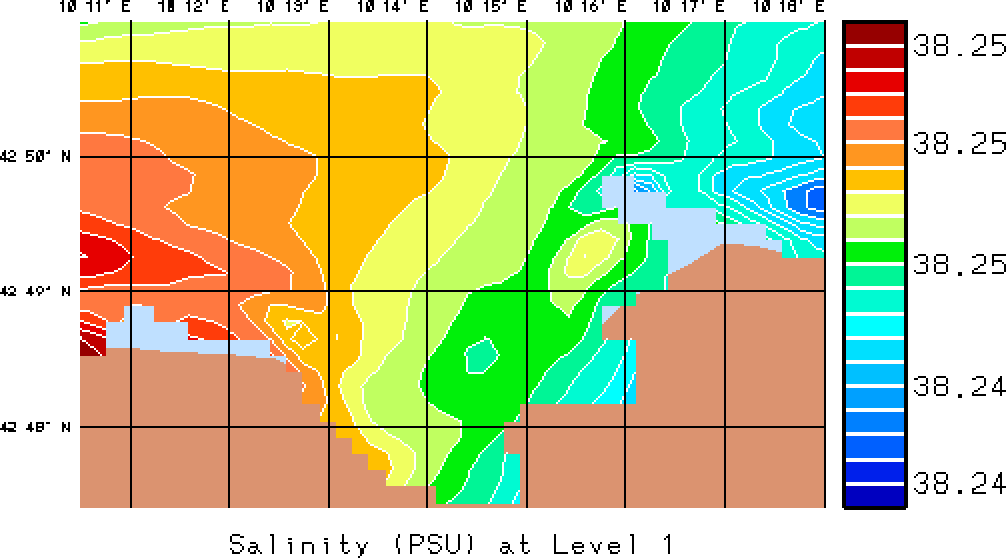 The results presented below show temperature, salinity and total velocity vectors at the surface. The velocity magnitudes seem small. A re-examination of the Elba-domain model parameters is underway. The land-mask on the velocity plot is the same as on the temperature and salinity plots, although it appears over simplified. The coasts plotted are for display purposes only.